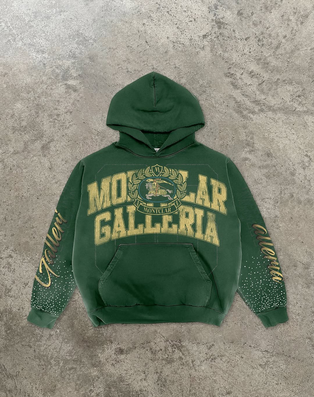 The standout feature of this washing hoodie is its customization potential. The chest’s “MONTCLAR GALLERIA” text and gold-accented badge can be replaced with your brand’s logo or tagline, creating instant recognition. The sleeves’ cursive text and dotted patterns are also fully customizable, allowing you to incorporate unique designs or messaging. Check out our blog for tips on leveraging custom washing hoodies for branding.